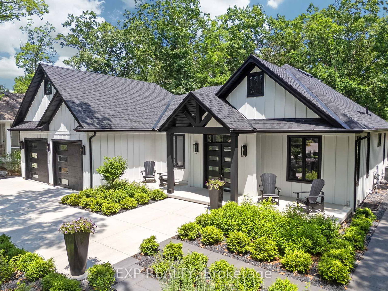 WELCOME TO YOUR LUXURY ESCAPE IN PINERY BLUFFS. Nestled just north of Grand Bend in the exclusive community of Pinery Bluffs, this exquisite executive bungalow offers refined living on over half an acre of professionally landscaped grounds. Boasting more than 3,300 square feet of finished living space, this stunning home features 2+2 bedrooms and 3.5 bathrooms, expertly designed and decorated with upscale, high-end finishes throughout. From the moment you enter, you're greeted by the elegance of porcelain tile flooring that spans the entire main level. The open-concept kitchen is a chef's dream, complete with top-tier appliances, a built-in coffee nook, and a spacious breakfast area with walkout access to a large covered deck perfect for morning coffees or evening gatherings. The inviting living room seamlessly connects to this space, creating an ideal layout for everyday living and entertaining. The main floor also includes a sophisticated formal dining room, a spare bedroom, a stylish 3-piece bath, a powder room, and a laundry room for added convenience. The luxurious primary suite features a generous walk-in closet and a spa-like 5-piece ensuite with elegant finishes and serene views. The fully finished lower level with in-floor heating radiant floor expands your living and entertaining options with a massive Rec room, cozy electric fireplace, custom bar area, two additional bedrooms, a home gym, and another full bathroom, making this space perfect for guests, family, or a quiet retreat. Step outside to enjoy the meticulously landscaped yard, where a stone-paved path leads through lush gardens to a charming shed near the peaceful forest edge. The oversized two-car garage and wide, double-paved driveway offer plenty of parking and curb appeal. This one-of-a-kind luxury home is truly a showstopper. Book your private tour today and take the first step toward living in paradise. Welcome home to Pinery Bluffs!