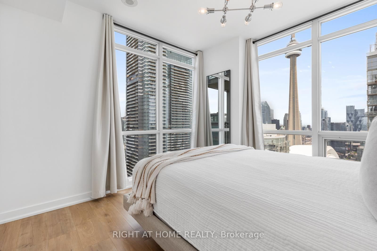 Bright and Airy Renovated Corner Suite with Unobstructed City & CN Tower Views . Welcome to this stunning, move-in ready corner unit on the 52nd floor at 11 Brunel Court, offering truly unmatched panoramic views of the CN Tower, Spadina corridor, city skyline, and lake. With exposure to the west, north, and east, this thoughtfully upgraded suite features $50,000 in floor-to-ceiling renovations and a bright, open layout that maximizes both space and scenery. This suite boasts a Fully renovated, open-concept layout (Wall professionally removed)to create an expansive kitchen and living area space. Custom drop ceilings with pot lights and ambient lighting in kitchen/living room. Gorgeous Wide-plank laminate flooring throughout . Fully renovated kitchen features soft-close cabinetry, drawers for all lower cabinetry, built-in garbage drawer, panel-ready dishwasher & Dark gray quartz countertops including oversized waterfall island. Living space designed with a Custom floating TV cabinet w/ integrated lighting & concealed cabling . Spa-inspired bathroom with custom glass shower & Smart dimmable lighting throughout. Primary bedroom with full CN Tower views. The unit also includes a Premium P1 parking space (conveniently located near elevator) & Oversized P1 storage locker . Building Amenities include the following : Two fully equipped fitness centres Indoor basketball court, games room , Olympic-sized swimming pool, whirlpool, sauna ,27th-floor sky lounge with hot tub & panoramic city views. Building has recently Renovated with updates to lobbies, gyms & common areas (elevators scheduled for upgrade in late 2025). Further features include 24/7 concierge and secure package storage Dog run, landscaped courtyard, visitor parking, and car wash bay. Location is 10/10 featuring an Exceptional walk score, Steps to TTC, waterfront trails, Harbourfront, and community rec centre - Quick access to Gardiner Expressway and downtown core.
