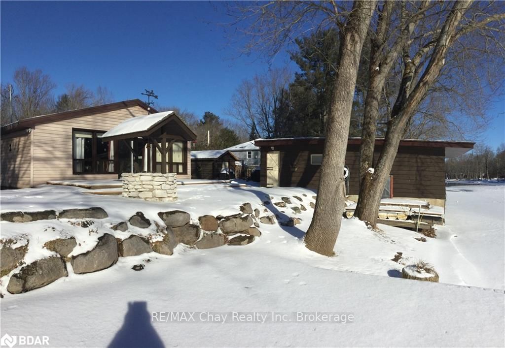 Enjoy four seasons on the Trent Severn Waterway! This great waterfront property features a pan abode cottage with metal roof, separate bunkie, two slip wet boathouse with a mezzanine level workshop and a separate large storage shed. Outdoor entertaining is a delight with the multi-tier patios and decking and lovely landscaping that leads down to the large cantilever dock and a second floating dock. The open concept, four season, bungalow features wall to wall windows overlooking the Severn River in the large great room, open kitchen with many cupboards, storage room, two bedrooms and a 3 piece bathroom. The cozy bunkie offers sleeping for 5. The wet boathouse has two slips, an electric door opener, loft storage and large workshop with a hoist from the slip. Recent updates include spray foam to crawl space, new lighting & ceiling fans, covered front porch. Swim, boat, snowmobile - enjoy this property year round! Located around the corner from Lock 42, this section of the river sees le