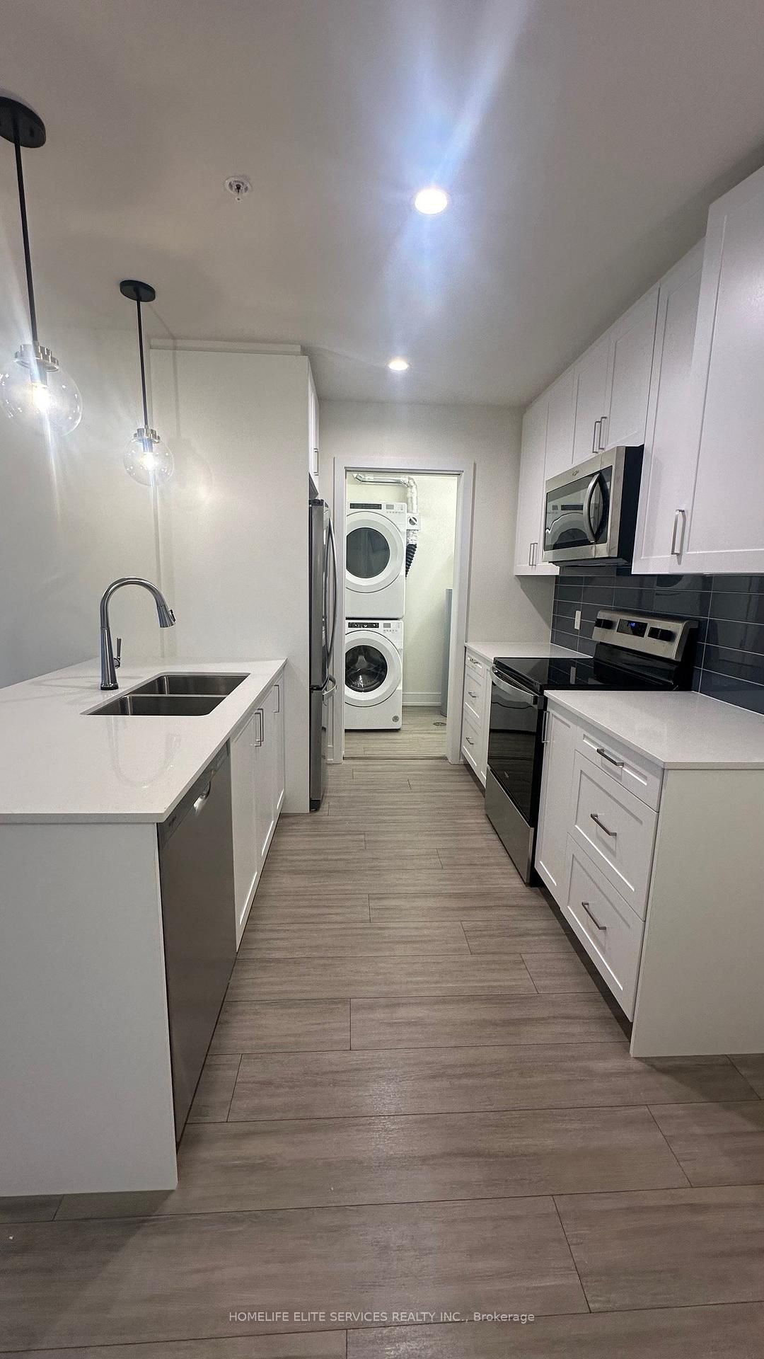 Built-in microwave, stainless steel stove with cooktop, stainless steel fridge, stainless steel dishwasher, stacked white washer and white dryer.