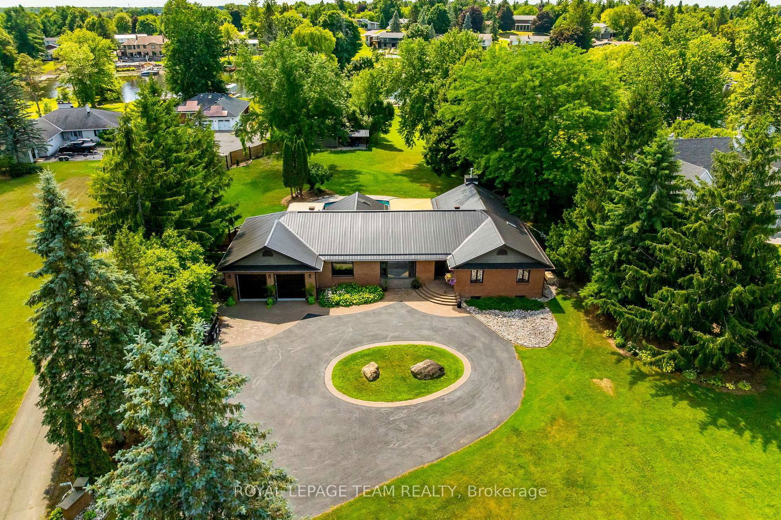 A rare offering along a serene stretch of the Rideau River just moments from the heart of Manotick, this exceptional 3-bedroom, 2.5-bathroom estate bungalow is set on a beautifully landscaped 2.25-acre lot with 60 feet of pristine waterfront. A private paradise, the property features a resort-style backyard with a gorgeous salt water in-ground pool, mature trees, and sweeping views of the river. Step inside to discover a grand entry adorned with travertine marble flooring, leading to a spectacular library crowned by a vaulted cedar-plank ceiling. Floor-to-ceiling bookshelves, complete with a rolling ladder, create an atmosphere of refined charm, while a dramatic double-sided fireplace connects this space to the expansive sunken living room and rear deck beyond. The chef's kitchen is a showpiece, seamlessly open to the main living areas; designed for both entertaining and daily luxury. Rich granite countertops, an abundance of custom cabinetry, and a high-end gas range are paired with a unique breakfast nook offering warmth and style. Bathed in natural light, the four-season sunroom is a seamless extension of the living space, with multiple sliding glass doors opening to the tranquil grounds. The primary suite is a true retreat, with direct access to the deck, a cozy gas fireplace, custom walk-in closet, and an opulent 5-piece ensuite complete with double vanities, soaking tub, and glass-enclosed shower. The partially finished lower level with new flooring & 9ft ceilings offers flexibility for additional living or recreation space. Recently updated landscaping and a lush canopy of mature trees provide privacy and timeless beauty. Nestled in one of Ottawa's most coveted communities, this home is just minutes from boutique shops, fine dining, excellent schools, and the village charm that makes Manotick so desirable.