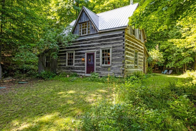 Whimsical century log home on tranquil 24 acres, known as Whisper wood, that includes 700' on Benson Lake & Boreal forest. Facing east over the lake, you are surrounded by serenity graced by biodiversity of natural flora & wildlife. Plus, delightful visits from blue herons, ospreys, loons, ducks & deer. Fill with timeless character, authentic 1860 square-cut log home has wide-plank softwood floors, high ceilings & original wood finishes. Living room efficient Regency woodstove. Dining room with antique hutch. Enchanting kitchen offers antique island & second hutch. Main floor bedroom walk-in closet & 2-pc ensuite. Second bathroom claw tub with shower unit. Upstairs, big open loft for your primary bedroom. Lower level laundry room & workshop. Home has new 2021 metal roof. Detached garage-workshop & Bunkie, both have hydro. Lake for kayaking or boating to Rideau Canal. Conservancy land is across road. Near Rideau Trail. Starlink in area. Private road $325/yr. 20 mins Westport.