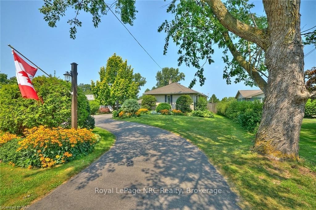 Prime location and most desired lot size! Almost 1 acre property fronts onto vineyards and backs onto Queenston golf course. The spacious custom built bungalow features 4 bedrooms, 2 full baths, primary bedrm walk in closet and main floor laundry room. An expansive kitchen has numerous cabinets, lots of counter space and peninsula open to dining room and partially open to living rm. Floor to ceiling windows overlook the 2 tiered deck, inground pool and a beautiful vista of green space and trees with no rear neighbors. The property extends past the split rail fence to a nature ravine adjacent to a walking trail and golf course. The unique lower level offers lots of finished space for family comfort or entertaining friends. It has the ambiance of a country pub with barn board, rustic brick and a warming gas stove fireplace in family rm. The game room features a library, pool table and a vintage phone booth. There is a workshop, cold cellar and lots of storage throughout. Outside there is