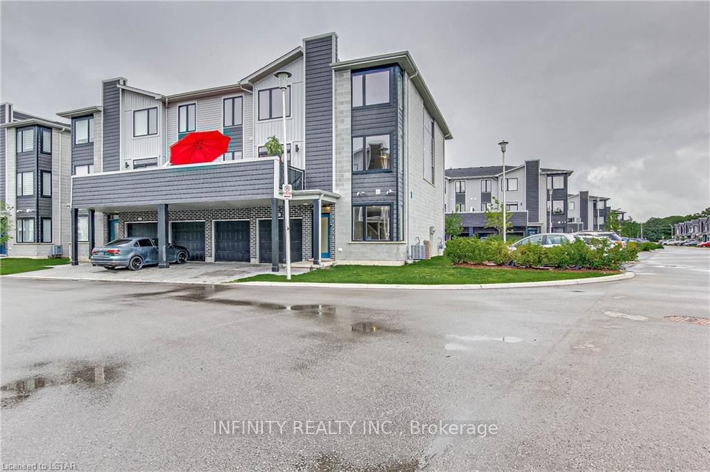 Enjoy maintenance free living in this Fabulous 3 storey END UNIT Townhome with attached DOUBLE car garage & 2 additional parking spaces in the driveway!! This spacious 3 Bed, 2.5 Bath townhome with LOW CONDO FEES features a main level Flex Room/Den that could be utilized as a Home Office, Sitting area or Gym. Contemporary open concept 2nd level w/ high end finishes including 9ft ceilings, loads of pot lights, engineered hardwood & ceramic flooring, gourmet kitchen w/ large island & quartz countertops, 2pc bath, conveniently located laundry room w/pantry, Living & Dining area w/ large windows offering an abundance of natural light & patio door leading to a private balcony, perfect for entertaining or relaxing. The next level features a Primary Bedroom w/4pc Ensuite & walk-in closet, 2 additional Bedrooms and 4pc bath. All this conveniently located close to many amenities such as schools, parks, green space, walking trails, shopping & restaurants. Short drive to Fanshawe College, London Regional Airport & easy access to 401. All exterior and ground maintenance is completed by Condo Corp. Original owner, never a rental & move in ready!