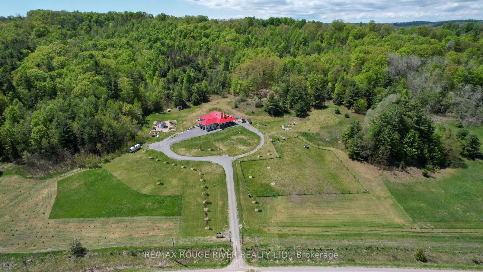 Crafted with precision and completed in 2022, this stunning custom-built home offers refined living in a private, natural setting. Sited on 37 acres of rolling countryside with panoramic views, walking trails, and thoughtfully designed outdoor spaces, this property is a rare retreat just minutes from town. Step inside to a breathtaking great room with 21' vaulted ceilings, anchored by historic beams, and a striking STUV airtight fireplace. The chefs kitchen is a true showpiece, featuring leathered granite countertops, cherry cabinetry, and a premium Monogram range and hood ideal for both everyday living and entertaining. The main floor includes a luxurious primary suite with a spa-inspired ensuite and custom dressing room. Two additional bedrooms each feature their own 4-piece ensuite baths, providing comfort and privacy for family or guests. The beautifully finished lower level with a walkout expands your living space with two more bedrooms (or home offices), additional living space, and ample storage. Outside, enjoy a full wrap-around covered porch perfect for alfresco dining, a gazebo, and open-air lounging areas all designed to capture the stunning views across your private acreage. A true blend of luxury, tranquility, and craftsmanship