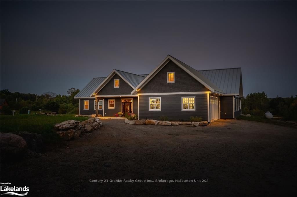 Experience luxury and tranquility in this meticulously crafted home, nestled on 4.5 acres just minutes from Haliburton in the exclusive Gainforth Estates neighbourhood. Completed in 2022, this 4 bedroom and 2.5 bathroom bungalow has been built using only the finest materials, with no detail overlooked and no expense spared. This property offers a serene escape with direct access to 41 acres of adjacent shared parkland including trails and a beautiful deep water pond for swimming, fishing, canoeing and kayaking - a nature lovers paradise! With nearly 3000 square feet of refined living space on one floor, this home exudes both grandeur and warmth. A spacious foyer leads into the the open concept living space which was designed for entertaining with its impressive 10-foot ceilings, bespoke millwork, timber-frame accents, floor-to-ceiling propane fireplace and extensive windows and multiple walk-outs for easy access to the covered porch and bright, southerly views over the stunning property. The custom kitchen offers quartz counters, built-in panelled appliances, an oversized island with seating for 5 and the bonus of a butler's pantry with laundry for additional storage and prep space. The primary suite features an office space, walk-out to the backyard and an extraordinary spa-like ensuite with curbless shower, dual sinks and freestanding soaker tub. Three additional spacious bedrooms and a 5-piece guest bath complete this perfectly laid-out home. Additional features include: engineered hardwood and tile floors throughout with radiant in-floor heat, forced air propane furnace and central air, oversized septic and dug spring-fed well for exceptional water quality and supply. An attached garage provides convenient parking, additional storage and direct access to the mud room. Don't miss your opportunity to make this exquisite property in one of Haliburton's most sought after neighbourhoods your own, and enjoy this perfect blend of luxury and nature for years to come.
