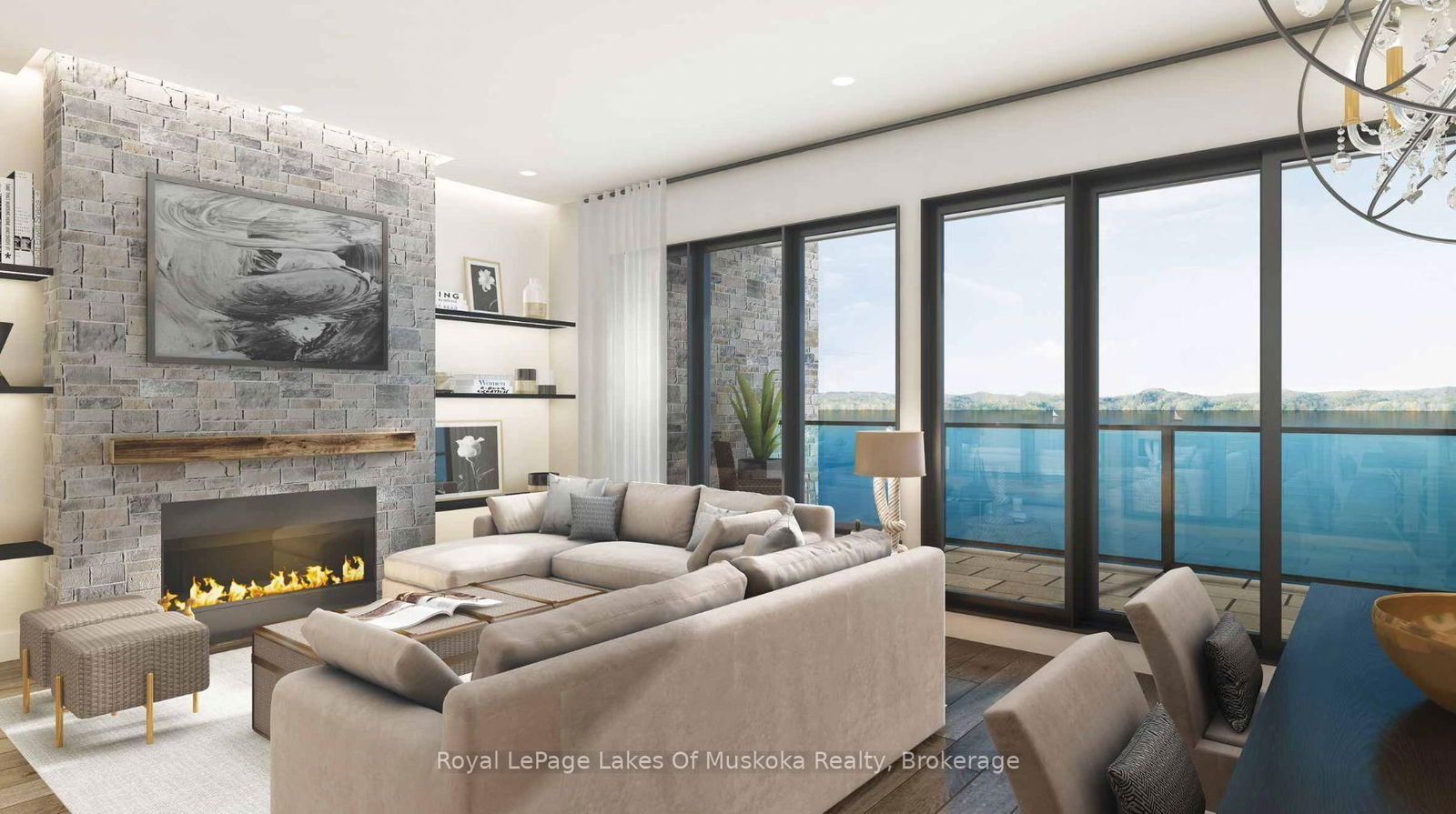 Welcome to Huntsvilles newest waterfront condo! This stunning 2-bedroom, 2.5-bathroom condo offers the perfect blend of luxury, comfort, and natural beauty in the heart of Huntsville, Ontario. Set along the tranquil shores of Fairy Lake, this modern residence features floor-to-ceiling glass that frames panoramic views of the lake and surrounding forested landscape, flooding the space with natural light year-round. Enjoy seamless indoor-outdoor living with a private balcony accented by sleek glass railings, perfect for morning coffees or sunset unwinding. The open-concept living space is anchored by a contemporary fireplace, adding warmth and sophistication to your lakeside retreat.The kitchen and bathrooms boast of high-end finishes, complementing the condos clean, modern design. Residents enjoy access to a state-of-the-art fitness centre and private beach. The buildings location offers unbeatable convenience just off of Highway 60, minutes from downtown Huntsville, close to golf courses and the natural wonders of Algonquin and Arrowhead Provincial Parks.