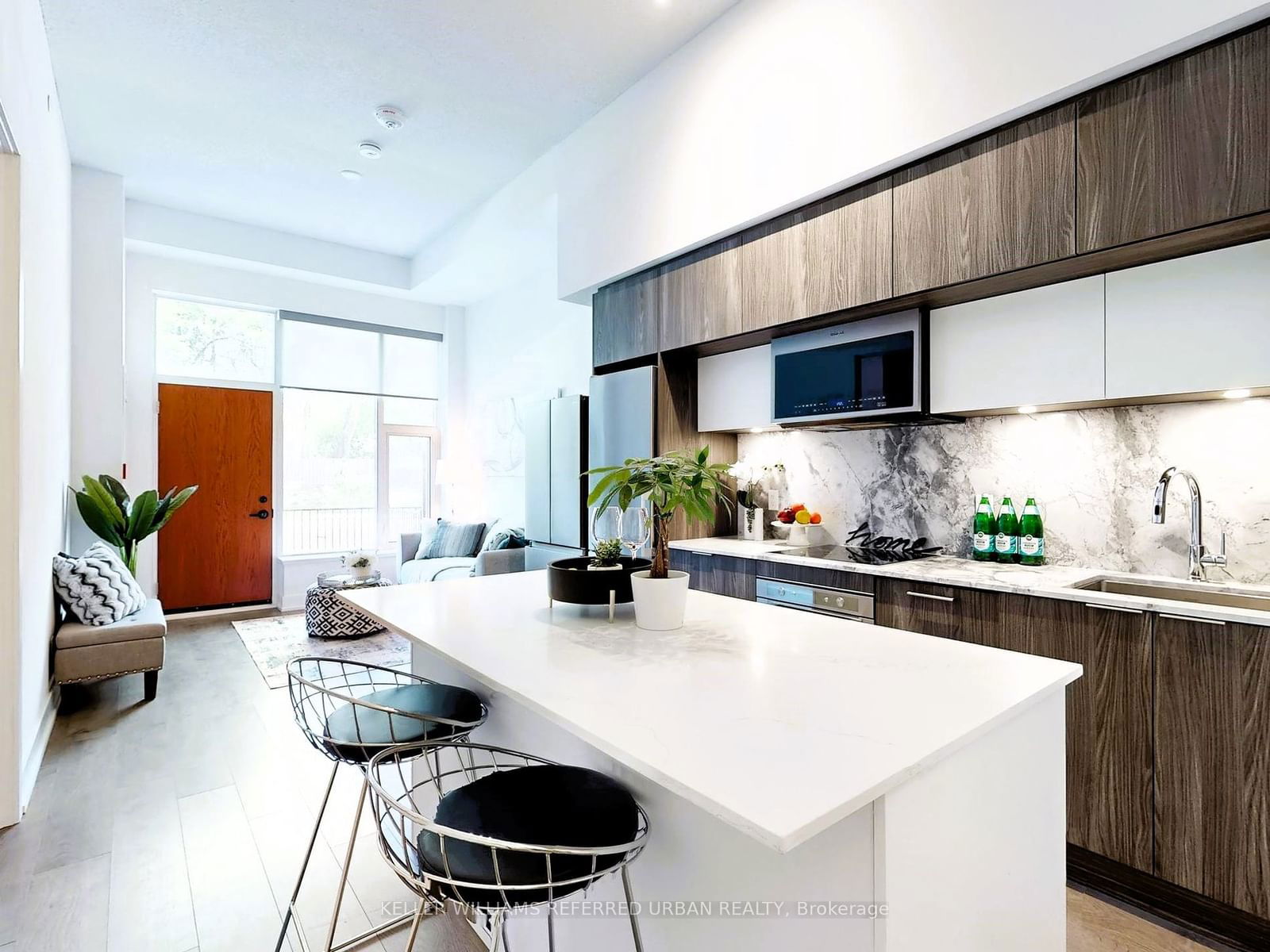 Must See! Purchase the rare Gem Ground level unit at Scala Condos. In the era of COVID-19, having two entrances is a Crucial Safety feature, especially for seniors or families with children. Originally the seller request, The den, upgraded by the builder with walls and a door, makes for a perfect second bedroom. Additionally, the custom-made island boasts ample storage space and two refrigerators are ready to carry all your delicious food. With a patio overlooking Leslie Street and 11-foot ceilings, this unit provide a townhouse-like feel. You don't miss it. Best location for Hwy 401, 404, North York General Hospital, Ikea, Fairview Mall.