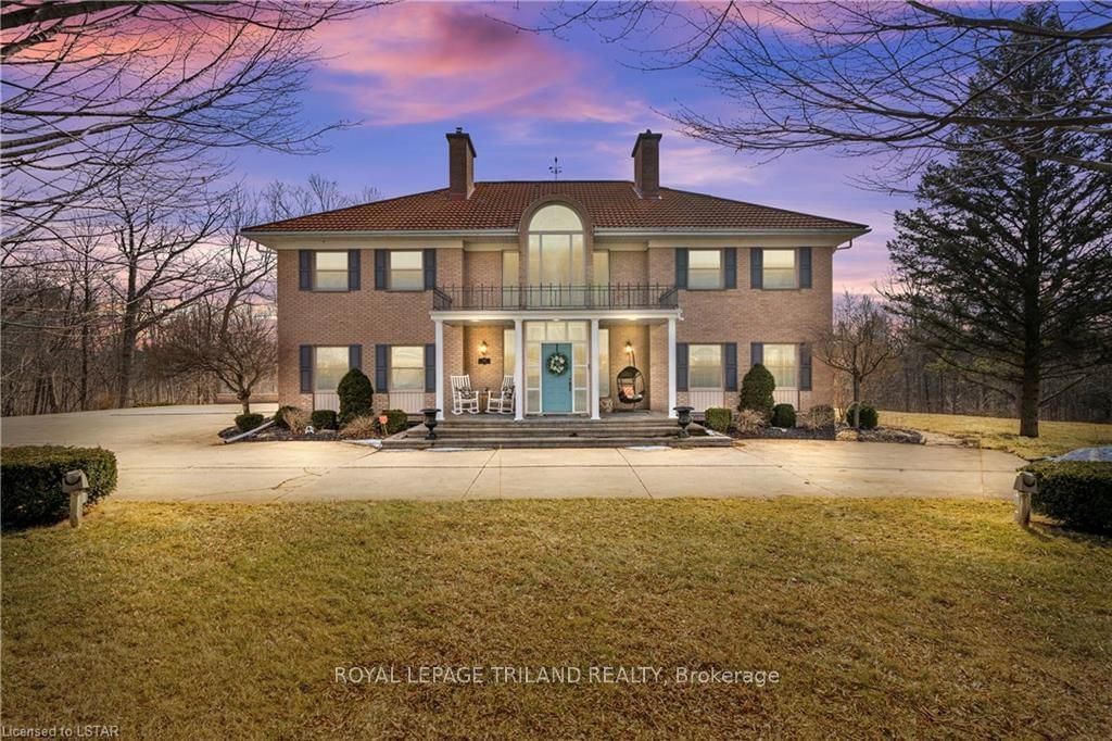 Conceived and built with zero compromises, this home is an estate-worthy property in the community of Strathroy that leaves no box unchecked. Sitting on a manicured lot measuring approximately 1.5 acres, the winding drive and courtyard lead to an outstanding home with over 8,000 sq feet of livable space; you'll be as happy with the home's size, privacy, and finishes as you are with the local amenities, community, and convenience. In a private enclave surrounded by trees and backing onto conservation lands, it blends a stately Georgian-inspired exterior with a clean, modern interior aesthetic. You'll be struck from the moment you enter the full-height foyer by how this home has been designed to let in light and provide excellent views of the property from all sides. The kitchen is a chef's dream, with high-end stainless appliances, granite work surfaces, and top-end cabinetry all anchored by a large island that make it a natural place to gather when entertaining family and friends alike