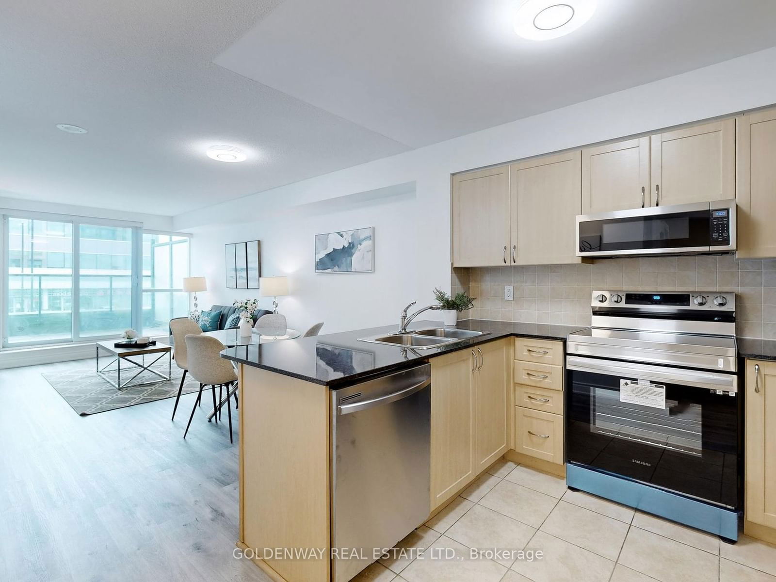 Beautifully Renovated In The Hyw 7 & Warden Area. This 1 + Den Unit Offers: Freshly Painted, Open Concept, W/O To Large Terrace, Brand New Vinyl Laminate Thru-Out Living Room, Bedroom and Den Areas. Washroom With New: Toilet, Vanity, Lights. Kitchen With Granite Counter, New Appliances, Washer & Dryer. Den With French Door Can Be Used As 2nd Bed Room. Steps To Viva Bus Stop, Shops, Schools, Restaurants & More..