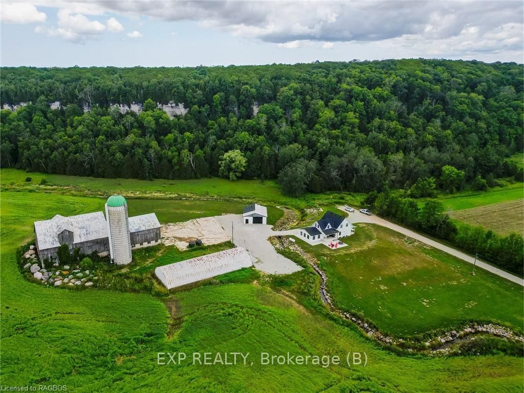 Welcome to this outstanding century farm with fully renovated home on 149 acres. Situated at the end of a cul de sac, the property sits against a backdrop of towering escarpment, a unique setting with long views of the countryside. With 143 workable acres, currently cash cropped, the very productive farm has been systematically tiled as needed and all fence lines removed. The 1870 home has been recently restored to a modern and elegant space with central air, forced air propane heating and hot water on demand. The kitchen features a large island, which can accommodate seating for 8, and two patio doors showcase the setting while providing lots of natural light. Deep windowsills enhance the open concept main level with a natural stone propane fireplace as the living room’s focal point. Completing this area is a two-piece bath. The second level has three bedrooms, four-piece bath with soaker tub and glass shower, and a separate laundry room with laundry tub. The spacious primary bedroom has views from every window. The attached garage, with its glass overhead door, numerous windows and finished floor, blends perfectly with the look and function of this home. The basement is bright and dry with all new mechanicals, great storage, and a cement floor and spray foam insulation. Enjoy the outdoor propane fire table, patios and beautiful verandahs with wooden posts. A year-round creek lined with stone runs near the home and adds to the tranquility of the setting. Outbuildings include a huge, high ceilinged bank barn very suitable for any livestock, including horses. There is also a Quonset hut (38x100ft) and a detached garage (32x40ft). Amenities include the Bruce Trail at your doorstep, an escarpment “look out “, ATV and snowmobile trails. Multiple golf courses in the area and a short drive to Wiarton or Owen Sound. This makes for an exceptional home or cottage with income opportunity through rental of the land and/or storage space. Come and view this distinctive property.