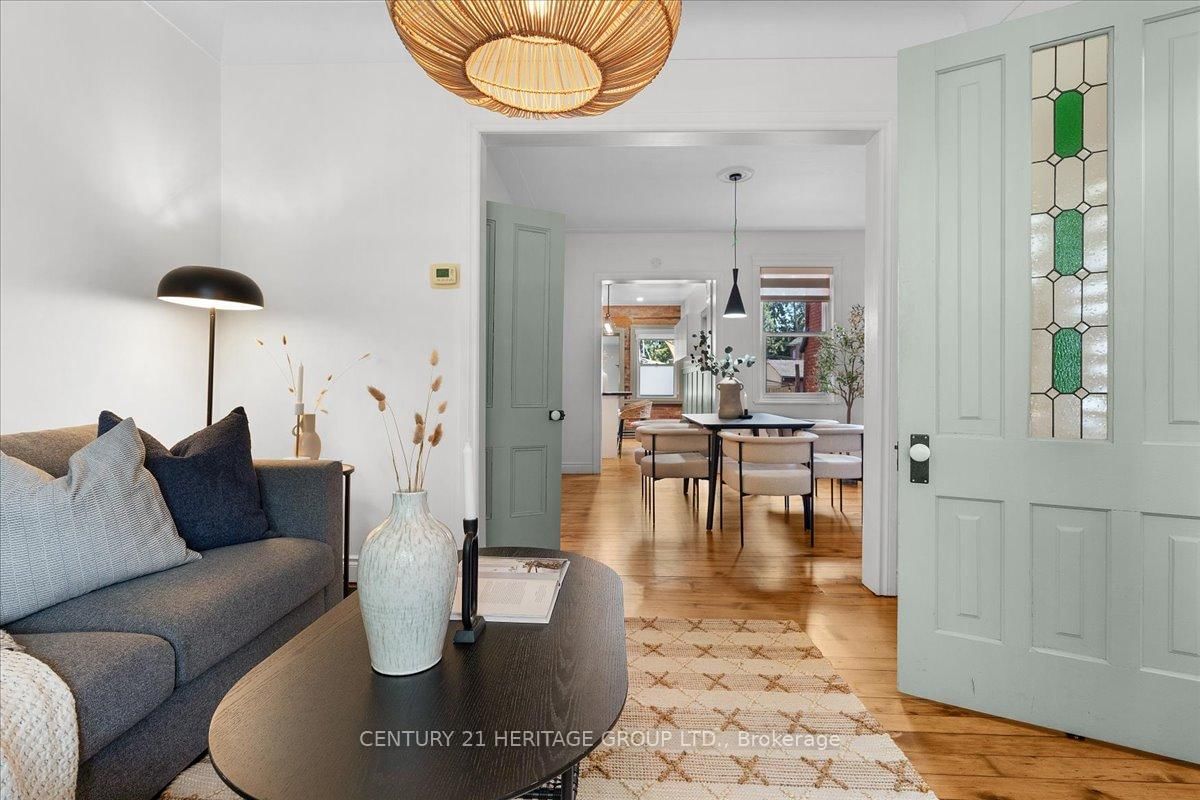 From the moment you step through the front door of 40 Emerald Street North, you're greeted by timeless elegance and modern comfort in perfect harmony. The spacious foyer welcomes you with a full closet, solid wood Victorian doors adorned with vintage hardware, and recently refinished original pine floors that flow throughout the home. High ceilings crowned with ornate medallions, lofty baseboards, and exposed brick create a warm, historic backdrop. The kitchen is a showpiece. Bright white cabinetry, stainless steel appliances, polished wood island, farmer's sink, herringbone backsplash, wainscoting, and a striking exposed brick wall blend beautifully with the home's century-old soul. Spacious principal rooms and tall windows fill the main level with light. Convenient powder room finishes the main floor. Wood stairs lead you up to three bedrooms, each with original doors, trim, hardware, and floors, along with a modern, sparkling bath. Everywhere you look, the best of old-world craftsmanship and thoughtful updates unite in style. The fully finished basement offers incredible flexibility. A private in-law suite, teenage retreat, or guest space featuring a living area that can double as a bedroom, a sleek 3-piece bath, kitchenette, and direct laundry access. Step outside to a fully fenced backyard, perfect for relaxing or entertaining, and a rare detached garage for parking or storage. Updates incl. all wiring and plumbing (2019), 50 year shingles on main roof (2020), all new windows and limestone sills (2019), furnace (2019), water heater (2020). All of this in a walkable downtown location, just steps to shops, restaurants, parks, and transit. 40 Emerald Street North delivers heritage charm, modern updates, and unbeatable convenience. It's a real gem in the heart of the city.