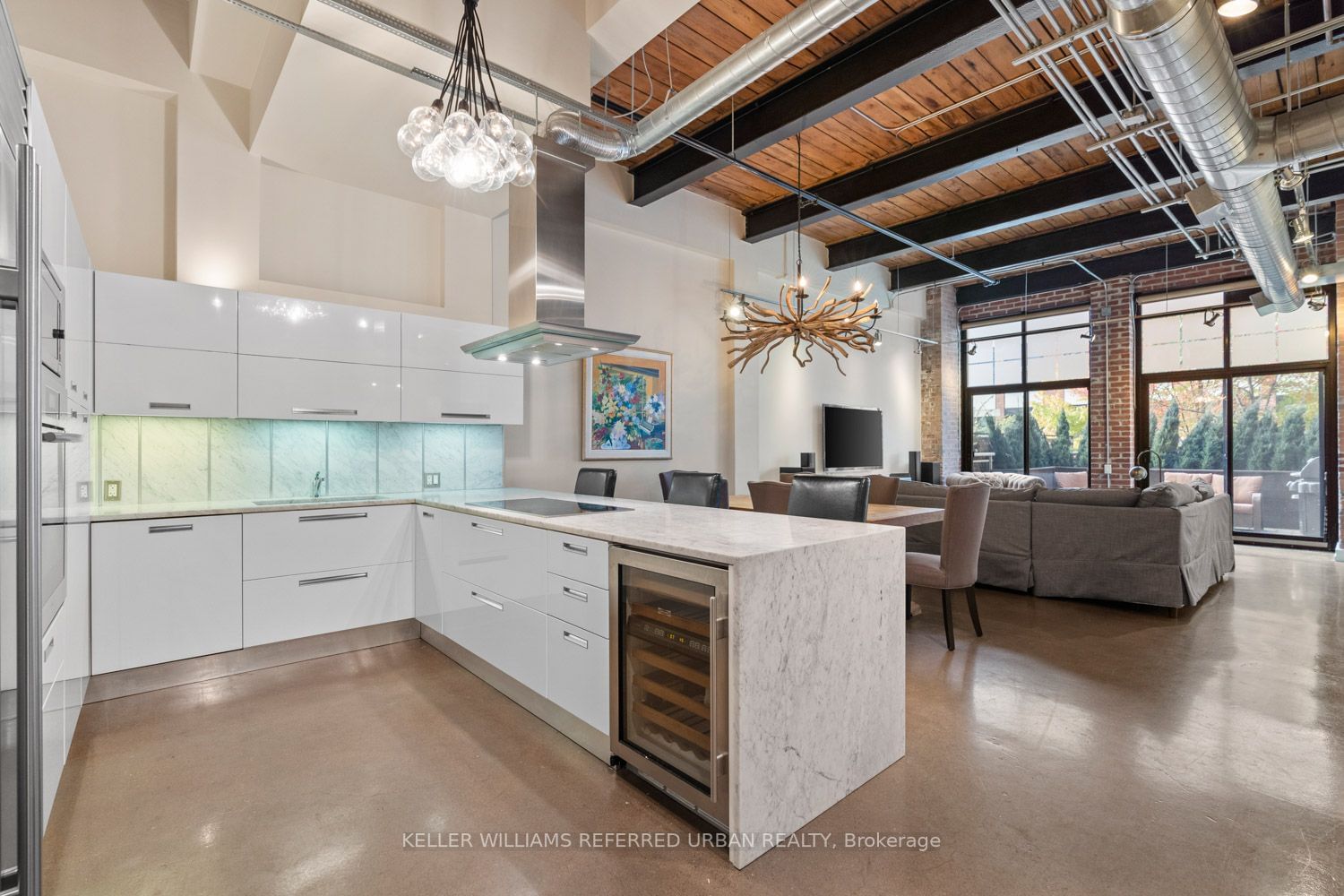 Indulge in the extraordinary allure of this meticulously crafted loft, an exquisite treasure nestled within the historical Toy Factory. Boasting an expansive +/- 1,475 sq ft of sheer elegance, the enticing space with a 191-square-foot terrace, offering a perfect harmony of open expansiveness & private sanctuary. Step inside to discover a seamless fusion of nostalgic charm & contemporary sophistication. The 13ft beamed ceilings stand as majestic testimony to the loft's heritage, complemented by original brick walls & meticulously restored concrete floors. Every detail tells a story of timeless charm.The culinary epicenter of this dwelling is a haven of culinary delight, featuring top-of-the-line Sub-Zero & Miele appliances. Scavolini white gloss cabinets & exquisite marble countertops, including a waterfall island, add a touch of modern luxury. A built-in wine fridge, separate storage room/pantry, & laundry room w/custom-built cabinets contribute to the practical elegance of the space.