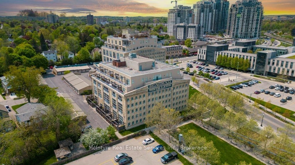 Stylish Seagram Loft Ground Floor with Character and Convenience and Commercial/Residential uses! Welcome to this unique ground-floor loftin the iconic Seagram Lofts a one-of-a-kind space blending historic charm with modern updates, perfect for those seeking style andfunctionality in the heart of UpTown Waterloo. Step inside to discover cork flooring throughout, soaring ceilings, and abundant natural light. Thekitchen is thoughtfully designed with newer cabinets, a tiled backsplash, and clever under-cabinet storage. New pot lights brighten the kitchen,while the living area features a built-in TV unit that stays with the unit. Upstairs in the loft, you'll find a spacious primary bedroom with a hugewalk-in closet complete with custom built-ins and stunning stained glass, along with an ensuite featuring tile floors and a built-in closet. Themain floor bedroom/den offers great utility and flexibility. Both bathrooms have tile flooring, with the main level bath boasting a floating towelstorage shelf and a new shower head. Additional features include: blackout blinds (top & bottom) and custom Velcro blinds over the patio doors,upstairs laundry, two outdoor parking spots, storage locker, and a built-in furnace filter exchange program included in condo fees. Buildingamenities include: guest suite on-site, gym in Building 5, games room with pool table in Building 3, wo bike storage areas, rooftop BBQ, and on-site property manager. This is your chance to own a piece of Waterloos heritage with all the modern touches you need.