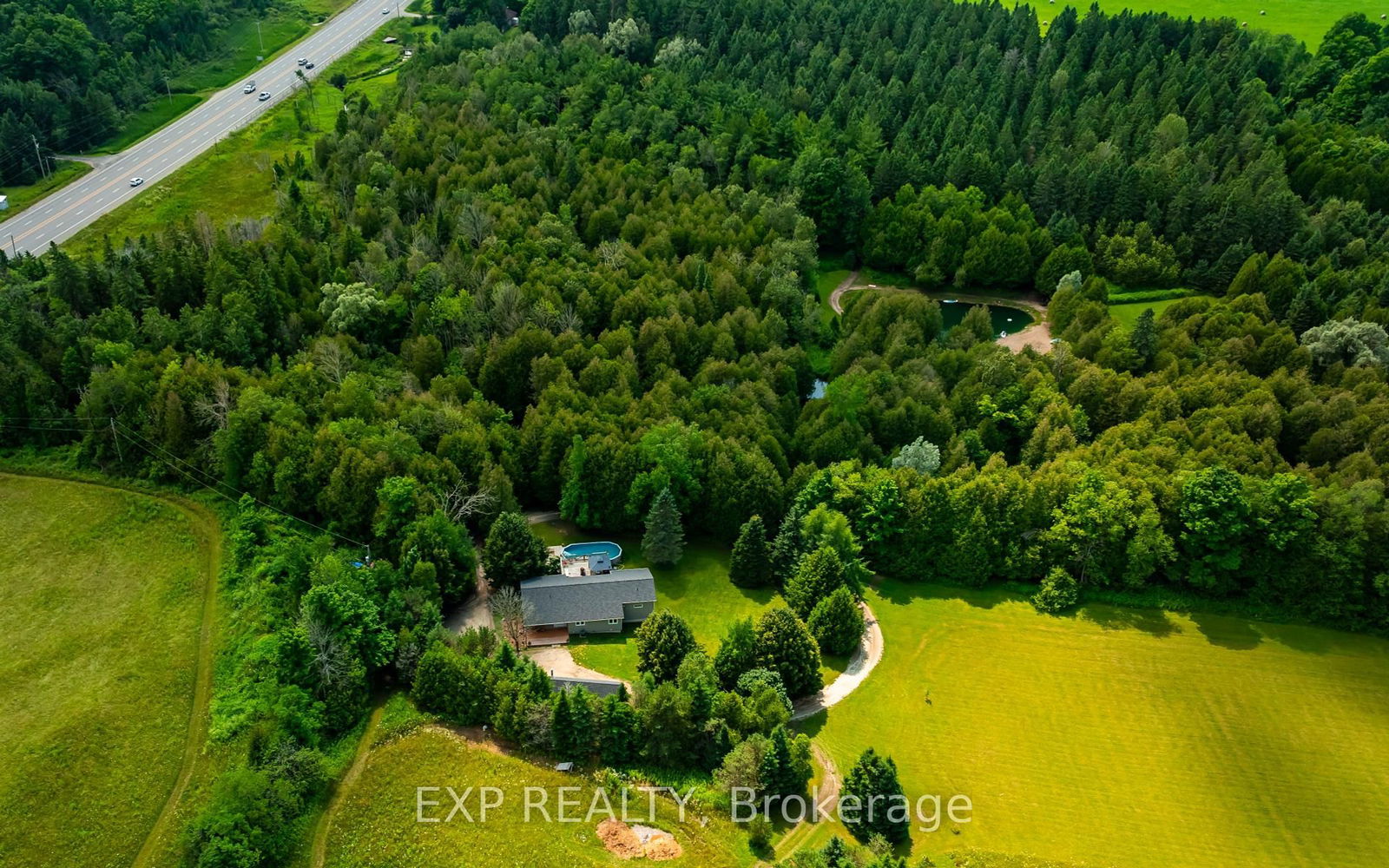 Prepare to fall in love! 33.5 acres including a 5 bedroom bungalow with a pool, your private pond & beach, and 2 cozy cabins creating a very successful nature retreat short-term rental business. Just a few minutes walking the trails around this property will have you head over heels. As you drive home down the winding driveway the sun peaks through the trees and welcomes you home. Convenient access off Highway 89, plus 2nd driveway off 2nd Line. The home itself is beautiful inside and out. The large back deck that leads you to the above ground pool is perfect for sunbathing, BBQs and entertaining. Inside, the open concept main floor has high ceilings, a beautiful wood feature wall with fireplace in the living room, dining room over looking the deck through huge windows, and a beautiful kitchen with unique backsplash, center island & stainless steel appliances. The spacious primary bedroom overlooks the pool through large windows and offers a great walk in closet and beautiful 4 pc bathroom. The main floor also offers 2 additional bedrooms, plus the 4th & 5th bedrooms in the basement. The basement is another great feature with a 2nd living space and above grade windows in almost every room. There is a second entrance that leads to the basement which provides lots of potential as well. There is a large yard beside the house perfect for soccer matches as a family, that is then surrounded by trees and trails leading you to the rest of this incredible gem of a property. Along the river and down the trails you will find a large pond that has been turned into your own private sandy beach. Next to the pond is a log cabin and down another trail is a newer 2nd bunkie. Both cabins offer guests a nature retreat experience and have been fully booked most of the year, providing approximately $60k revenue/year through the short-term rentals. Approx 10 acres of farmland offers even more income potential. This property truly has it all. I told you you'd fall in love!