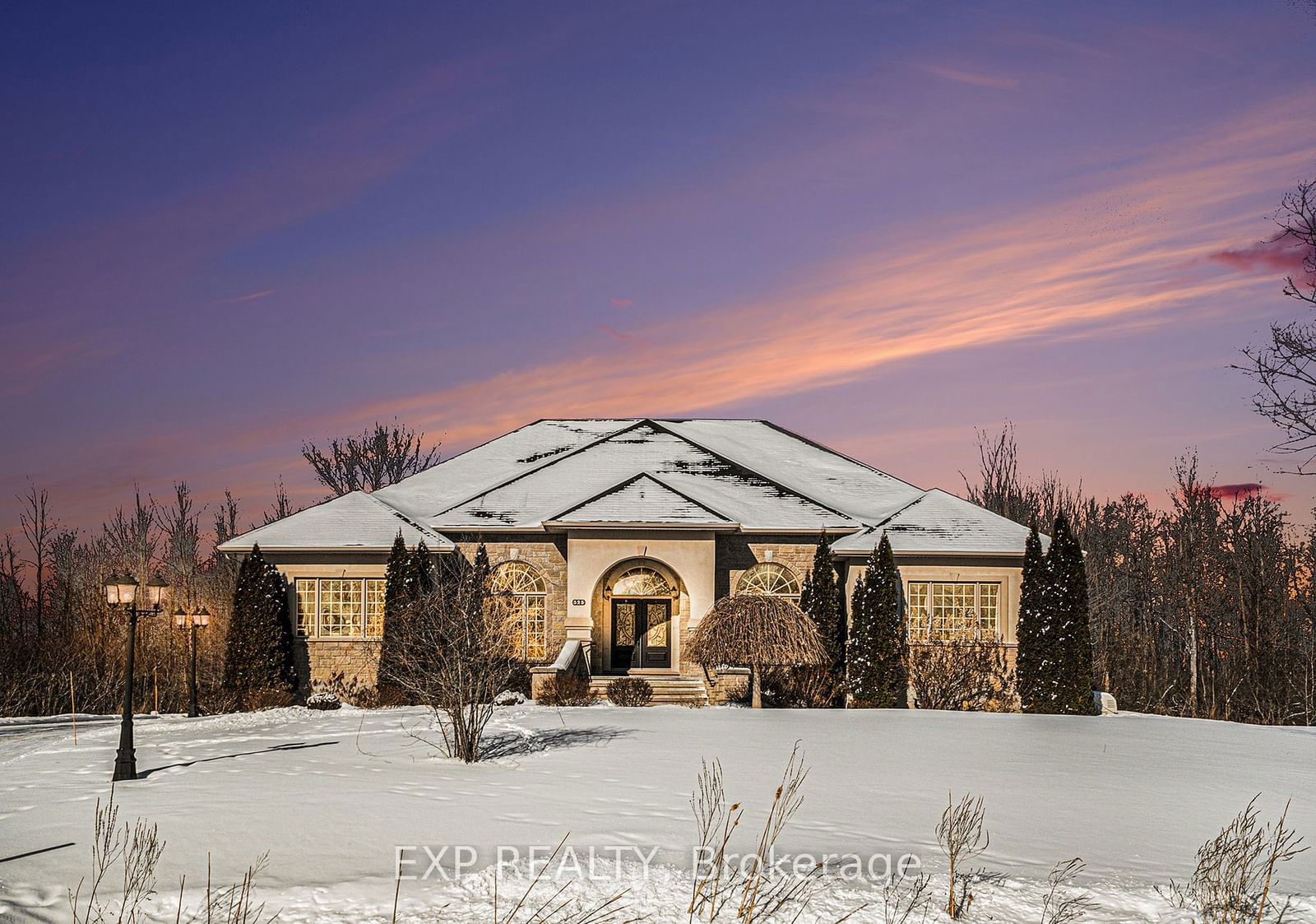 Experience the perfect blend of sophistication and tranquility in this exceptional executive bungalow, ideally located on an expansive estate lot just minutes from the city. Step into a grand foyer with soaring 12-foot ceilings, oversized windows, and exquisite hardwood flooring throughout. The spacious living room is a statement of elegance, featuring a stunning floor-to-ceiling fireplace and walk in sunroom. A chefs dream, the gourmet kitchen(2024) boasts custom cabinetry, a large center island, granite countertops, a gas range, top-of-the-line stainless steel appliances and sun filled breakfast area.  Grand entertaining size private dining room. The lavish primary suite is a private retreat, complete with a spa-inspired ensuite featuring dual vanities, an oversized shower and walk-in closet. Additional main-floor bedrooms are generously sized, each with their own ensuite as well as a main floor office.  The fully finished lower level is designed for both relaxation and entertainment, offering three additional bedrooms, a spacious family room with a gas fireplace, and ample space for family gatherings. Outdoor living is elevated with a private, beautifully landscaped yard(2023) and a large deck, perfect for entertaining all with upgraded with interlock in front and hot tub. A gas generator, a second sump pump, custom basement cabinetry, and a state-of-the-art water purification and softener system. New furnace 2022, New garage door 2021. New main sump pump 2024. New outdoor lighting 2022.  Move in and indulge in luxury country living at its finest.  Seller is a licensed realtor. 24 hrs on all offers