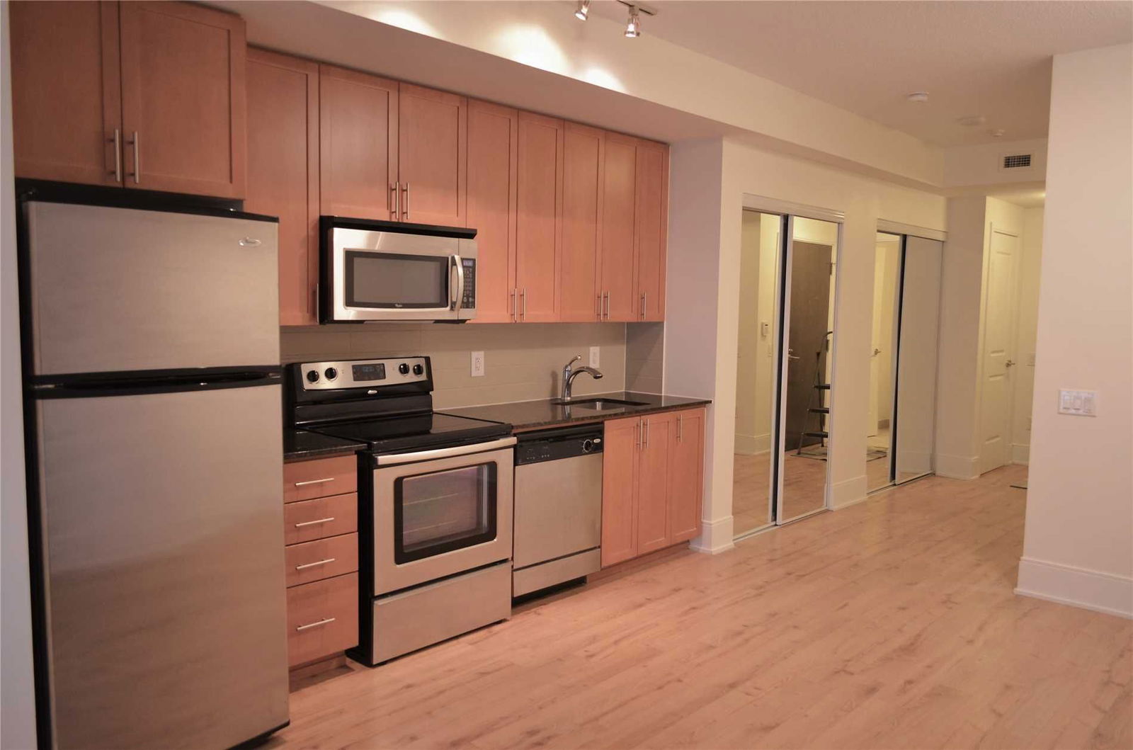 S/S: Fridge, Stove, Built-In Dishwasher, Combo Microwave/Hood Fan. Front Load Stacking Washer And Dryer. Plank Style Laminate Flooring. Oversized Mirrored Closets