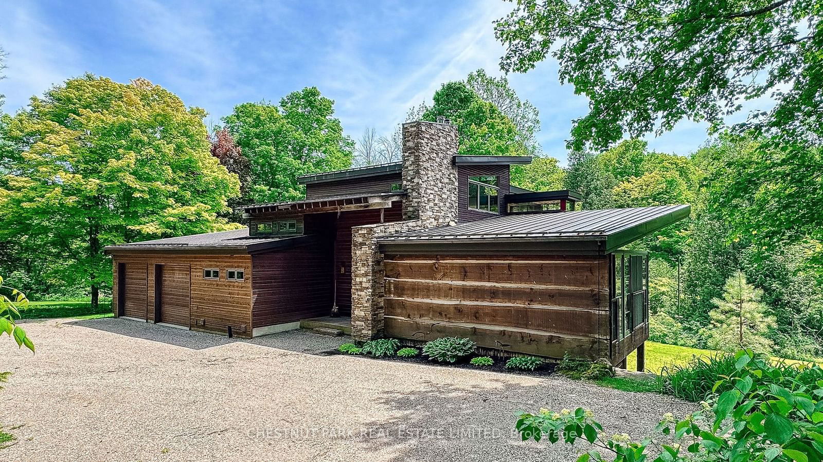 This property has the calming Pine River running right through it. It sits on almost 5 acres and features a custom-built architectural masterpiece. The house is a blend of stone, wood, metal, and glass that showcases the natural surroundings and boasts a unique contemporary design. With screened window walls, a Muskoka room, and walk-outs, you can fully enjoy the charming location with the soothing sounds of the river. The four-bed, three-bath home is filled with customized details, from special custom kitchen cabinetry and handles to the glass-encased stairwell, a hand-crafted two-level masonry heater with a pizza oven, and starlight ceiling lighting. The second level of the home is a dedicated primary bedroom suite with an office/yoga studio, balcony, spa bathroom, walk-in closet, and second laundry. This special property is delightful in all seasons. Come and experience the tranquil sound of the river!