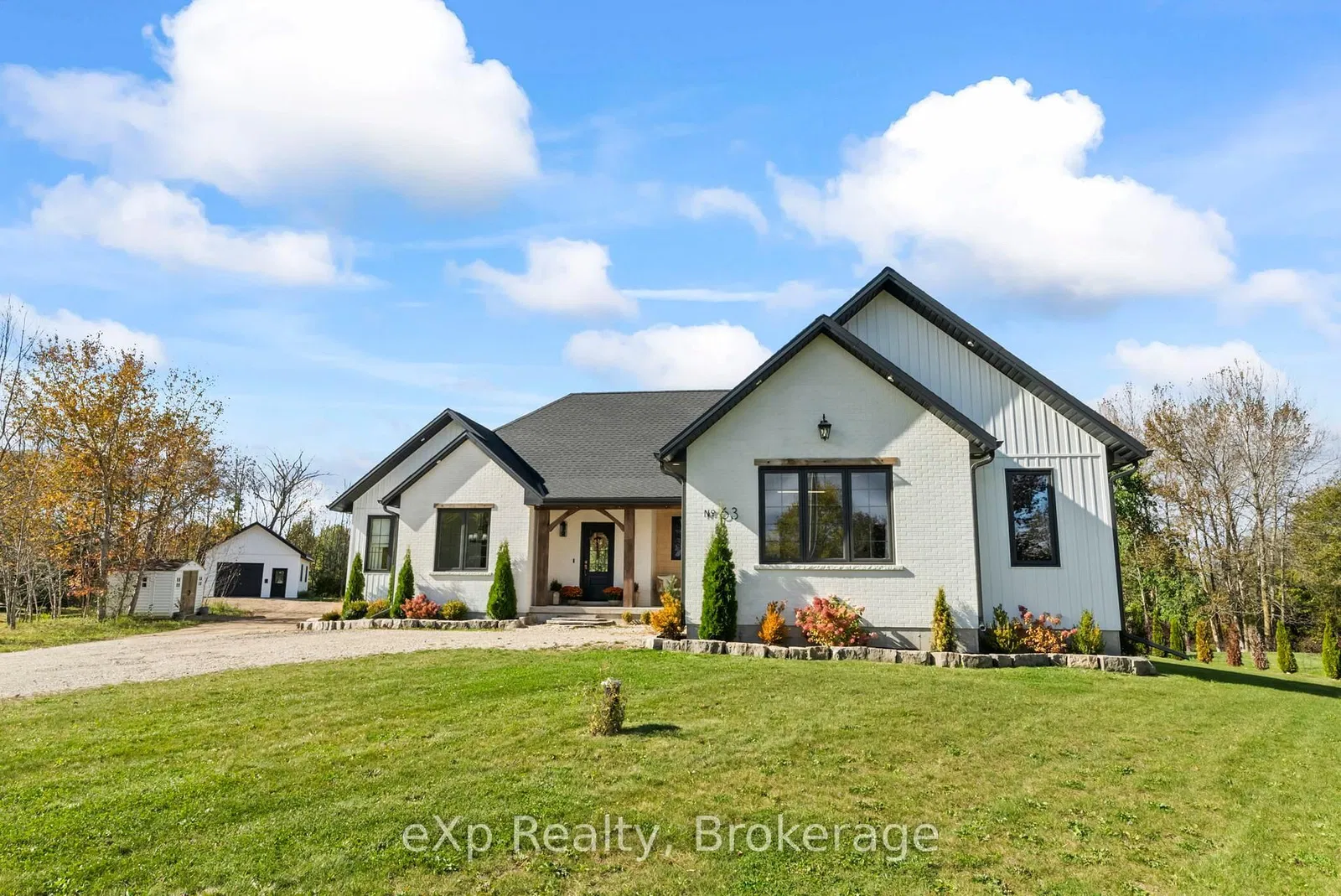 Modernized living meets country charm. This white brick bungalow accented with stone and crisp white siding is nestled on just over an acre, offering peaceful views with no rear neighbours. As you enter the front door through the covered porch, you're welcomed by natural light beaming throughout the entire main level that easily shines through the beautiful black windows. The Living room offers a cozy atmosphere with an electric fireplace, and the rustic wooden beams seamlessly connect the vaulted ceiling to the shiplap ceiling in the heart of the home - the Kitchen and Dining Room. The layout of this entire home screams entertainers delight. Seat friends and family along the 10 foot island, or in front of the large window overlooking the partially covered back deck with pool and hot tub at your farmhouse table. The porcelain tile backsplash glimmers oh so perfectly from any angle of inside the home. There is plenty of counter space, but the benefit of a butler's pantry is the chef's kiss. High end Cafe appliances and a farmhouse sink with a gold faucet which ties into the metals of the stunning light fixtures is truly a sight to see in person. The Primary Bedroom is a retreat, featuring a luxurious 5-piece ensuite with a large walk-in closet perfect for all those pieces transitioning you from day time business to night time casual. On the opposite side of the home, you will find two additional bedrooms, with another 5 piece Bathroom with double sinks, and tiled with a gorgeous neutral grey porcelain tile. Off the Kitchen is a mudroom leading you to a 2-piece Bath with laundry or out to your attached two car garage. The full, partially finished basement is awaiting your personal touch. An additional bonus of this property is a 25x28 detached fully equipped workshop perfect for the handy person or an additional hangout! Every finish in this home has been thoughtfully chosen, tying together perfectly to create a cohesive and inviting space.