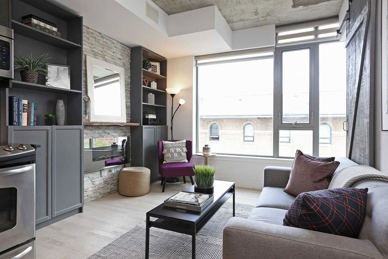 One Bed Riverside Condo With Character (No Really). No Wasted Space. High Exposed Concrete Ceilings, Light Hardwood Floors. Kitchen W Ss Appliances (Fridge New 2018). Built-In Media Unit W All-Natural Cultured Stone, Electric Fireplace + Tv Mount. Connect Iphone And Control Speakers In Every Room W Unit-Wide Radio/Music/Tv Hook Up. Grey Wood Barn Doors For Bedroom And Bath. Large Closet W Organizers In Bedroom. Utility Storage Closet And Full-Sized Laundry.