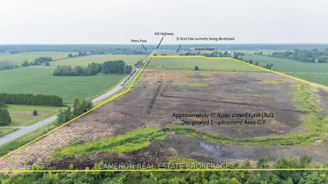 DEVELOPMENT PROPERTY..+/-56 acres (vacant land /undeveloped parcel) . This site is located just off Exit 804 (Summerstown Road) in South Glengarry, Ontario less than an hours drive to the West Island of Montreal . This property is located on the south east corner of Summerstown Rd and Airport Rd , south of the existing "Petro Pass Truck Stop" that is in operation located nearer to Hwy 401, and this +/- 56 acre site is on the opposite side of the Airport road facing the neighbouring 51 acre site that butts on Hwy 401 at Summerstown Rd that is currently being developed and under construction at this time to construct a +/- 28,000 sq.ft state of the art Truck Stop development. Seller required 2 business days irrevocable with any offer submitted as a listing condition.