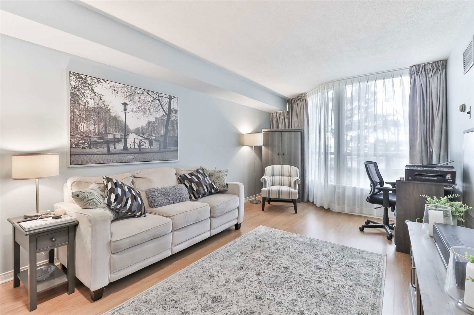 A Rare 1 Bedroom Move In Ready Gem At Kings Garden. Gorgeous Open Concept Layout, 1 Bedroom And 1 Washroom With Shower. Features Include Laminate Floors, New Ceiling Fan, En Suite Laundry, Custom Blackout Drapes And Blinds, Close To All Amenities Including Library, Groceries, Transit, Go, Square One And Major Highways; 403/Qew/401 In A Well Maintained Gated Building With A Swimming Pool, Sauna, Modest Size Gym, Quiet Library And 24 Hour Security Concierge.