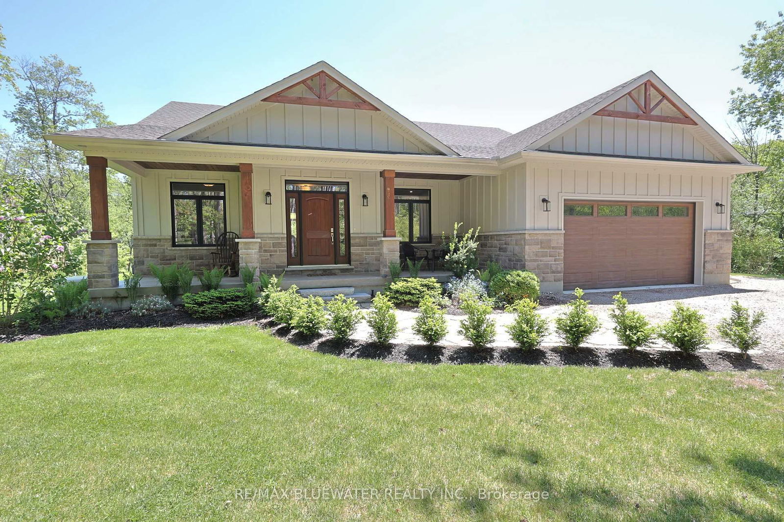 Custom built modern bungalow on a one acre lot surrounded by nature near the Pinery Provincial Park. Drive through the tree lined driveway and your greeted with your new home built in 2021 by Nicholson Builders. Great curb appeal with the landscaped gardens and flagstone walkway leading to the covered front entrance and front porch seating area. Inside, you have a 1742 sqft open concept design with well appointed finishes and flowing with natural light featuring engineered hardwood floors throughout the main floor. Step inside the front foyer and you feel the warmth of the space that invites you in and makes you feel at home. As you enter the living room you will notice the coffered ceilings above and a stone feature wall around the gas fireplace. The kitchen features quartz countertops on two tone cabinetry, large island with waterfall countertop edges, herringbone patterned tile backsplash and stainless steel appliances. Spacious eating area off the kitchen and living room with large windows overlooking the back yard and access to the covered deck. Main floor primary bedroom suite with walk in closet and beautiful ensuite that includes a double vanity and tile shower. The main floor also includes his and her separate offices that border the front foyer overlooking the front entrance or easily include a guest room on the main floor as both offices have full closets. There's an additional full bathroom off the main living space and a mudroom with laundry as you enter from the 22'x24' double car garage. Full finished basement with large family room that features and electric fireplace, 3 bedrooms for kids and guests or crafts, full bathroom, workshop for the handy person and lots of storage in the utility room. Entertain friends in your private back yard as you enjoy the 18' x 14' covered back deck with vaulted ceilings and pot lighting overlooking the tree lined natural setting and flagstone walkway leading to your armour stone firepit. BONUS: GENERAC Generator!