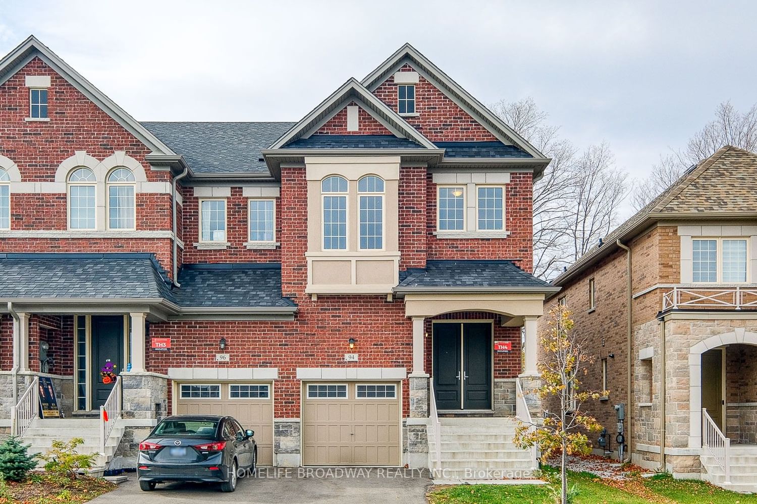 Very bright END UNIT Townhome, like semi, 3.5 years old, Luxury Finishes Nestled In A Premium Private Lot. Back To Beautiful Mature Trees In High Demand Oakridge Community* Golf courses nearby. French double door entry into spacious foyer. 9ft Smooth Ceiling On Both Levels* Hardwood Floor Through Out* Fresh painting entire house (2023.11)* Modern Kitchen With Quality Stainless Steel Appliances, brand new backsplash (2023.11)* Breakfast area walkout to yard and Open To living room With window* Smooth ceilings, pot lights, quartz counters in kitchen and bathrooms, tray ceiling in primary, direct access from garage, pre-wired security system. 2nd FL family room can be changed to 4th BR. Primary Bedroom With W/I Closet and 4-pc airy Ensuite free-standing bathtub * Large Basement With Windows, 3 Pc Rough-in * Min To Hwy 400/404.