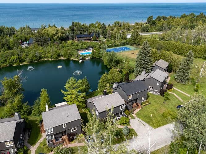 Nestled on 5 serene acres, Hidden Lake offers a tranquil and friendly community centred around a stunning private 1-acre lake. Beyond the swimmable, trout filled lake, enjoy resort style amenities shared with fellow homeowners: a sun-drenched outdoor pool, tennis/pickleball court, trampoline for the kids, fire pit, and a sprawling field perfect for soccer or frisbee. A private gate connects you directly to the Georgian Trail - ideal for biking, hiking, x-country skiing, with a short stroll to beautiful Georgian Bay. Home #9 is an entertainer's dream - with 4 bed/4 baths, almost 3,000 sq ft of living space plus 400 sq ft of outdoor decks. Step in through the welcoming foyer to a spectacular view of the Hidden Lake through the open concept main floor. A large kitchen with breakfast bar & dining area flows seamlessly into the living room and out to the deck, perfect for gatherings. $100k spent on newly renovated bathrooms, sleek kitchen counters, skylight, pot lights, door hardware, Envirotech roof, new furnace & central air make this home modern & comfortable. Highlights - main floor large private bedroom or office, 2 newly rebuilt & waterproofed decks off the 2nd floor bedrooms, a retractable motorized awning on the back deck & Level 2 electric car charge outlet in one of the two private driveways beside the home. Waterproofed finished basement with 3-piece washroom, guest bedroom, games & media room, laundry & storage. As a common elements condo, homeowners share costs for the grounds & amenities, making this an amazing opportunity for all-season turn-key living. Evening cocktails overlooking the pond, morning pickleball tournaments followed by cannonballs off the diving tower, biking the Georgian Trail into Blue Mountain Resort or the town of Thornbury - your resort life has never been better! Minutes to ski hills, beaches, golf courses, hiking trails, and more. Life Peaks Here!