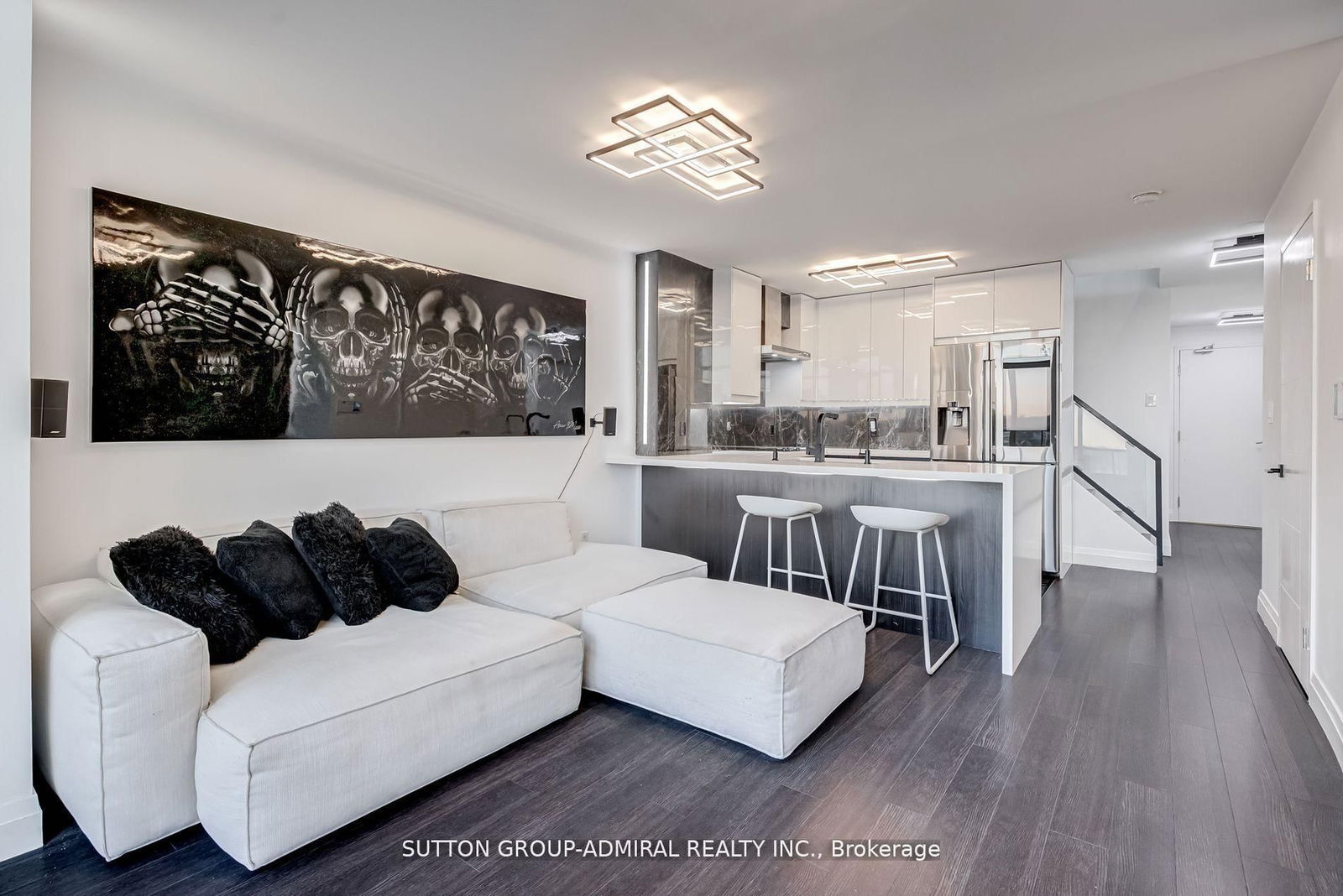 Recently renovated, fully furnished 2-storey loft at Mystic Point with an open concept layout. This tech-savvy residence offers smart home controls for easy monitoring from your phone. Features include LED lighting, Nest thermostat, smart fridge w/ internal camera, surround sound system. Reverse osmosis water filter system in kitchen. Living area offers brand-new natural gas fireplace and 75-inch TV. Balcony has natural gas BBQ outlet w/ outdoor seating. Master bedroom offers built-in closet cabinetry, flat screen TV, full bathroom w/towel warmer. 1 parking space & High Speed Bell Internet Included. Combining modern convenience with functional design, this lease opportunity is not to be missed!