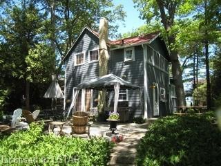 Excellent location for cottage or year round home with view of lake on large treed lot, close to beach access and marina for boaters. You cant get much closer to the beach without being lakefront! Quiet area, dead end street. Garage with storage loft. Updates include kitchen and bathrooms, electrical, gas fireplace is main heat source. Pine floors throughout. Laundry in main floor bathroom. 2 tiered cement patio on east side of house. This is a charming, one of a kind property. Serviced by municipal sewers and water.